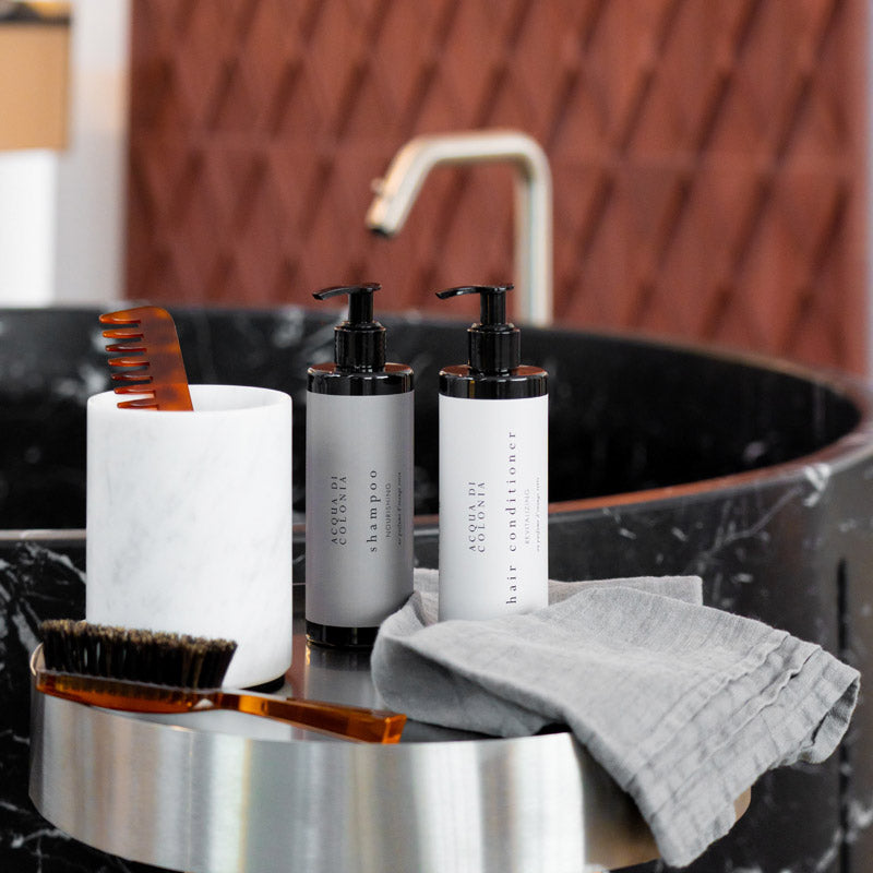 Après-Shampooing, Bidon de Recharge 5 L - Acqua di Colonia. Code: 026HCCOLONIA05 Support en inox brillant pour Distributeur 300 ml. Code: 02ASUFL0029 Support en inox noir pour Distributeur 300 ml. Code: 02ASUFL0030 Support pour distributeur en plastique blanc. Code: 02ASUFL0013FS Support en plastique noir pour Distributeur 300 ml. Code: 02ASUFL0014FS