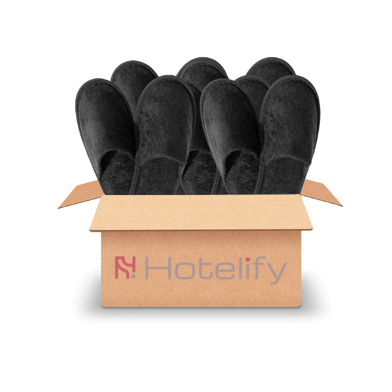 Offrez une expérience de séjour haut-de-gamme en proposant des chaussons pour hôtel fermés en éponge avec le Kit d'Accueil Chaussons Noirs en éponge fermés.
