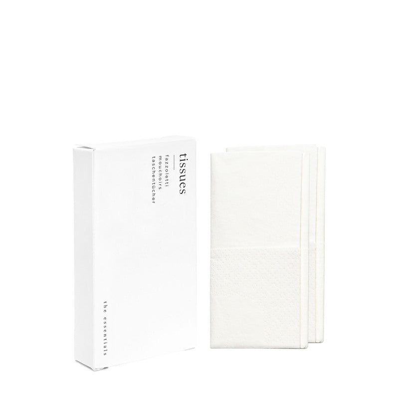 Kit de mouchoirs dans un étui en papier blanc 100 % recyclable.
