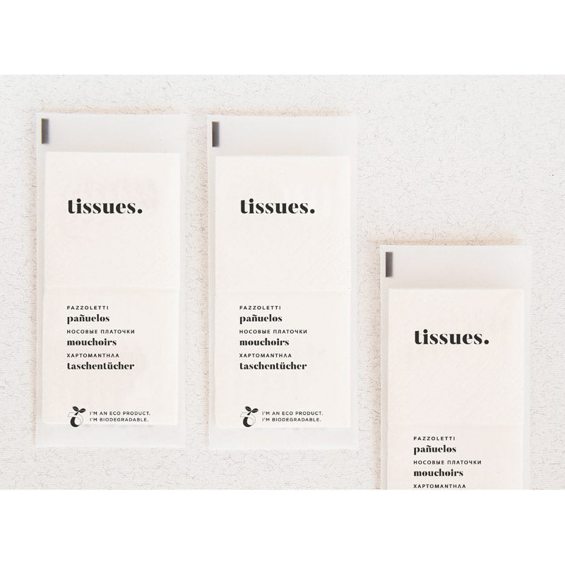 Kit de mouchoirs écologique en 100 % cellulose (compostable) conditionnés dans un sachet biodégradable, thermosoudé, transparent et satiné. Un accessoire durable et au design épuré pour rendre le séjour de votre hôte encore plus agréable. Facile à assortir à différentes lignes d’accueil.