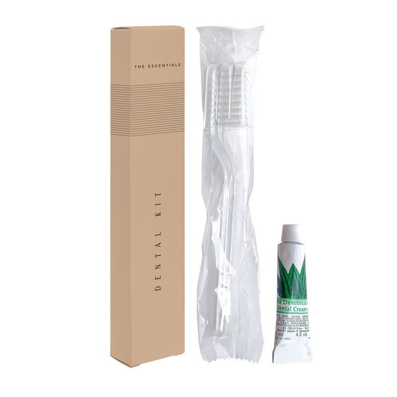 Kit d’hygiène buccale dans un étui en papier kraft 100 % recyclable. Un complément au design minimaliste et à l’aspect naturel qui s'adapte bien à différents types de structures, en association avec la ligne d’accueil classique.