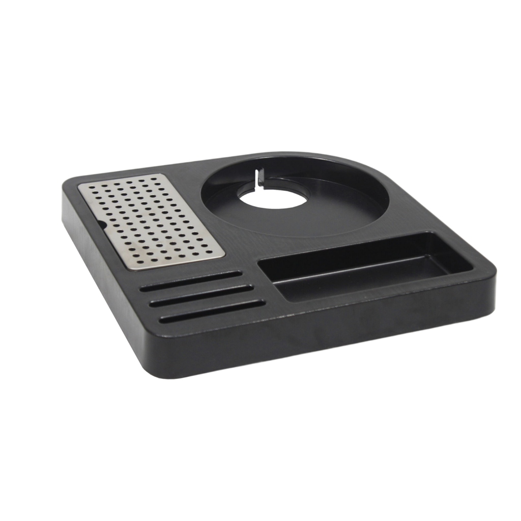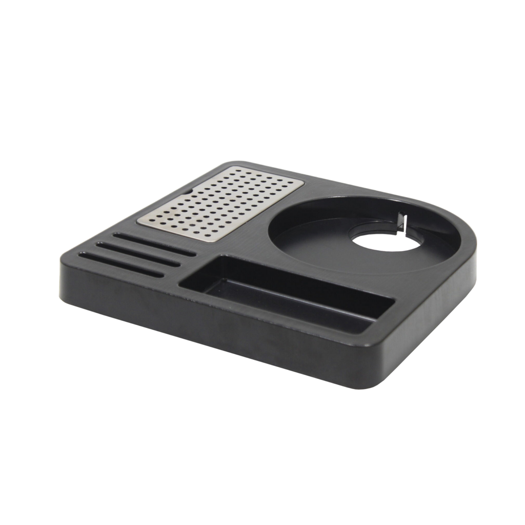 Plateau noir avec pieds antidérapants, grille en acier inoxydable amovible pour tasses et compartiments pour sachets. À associer aux bouilloires B2002ASU ou B2001PU.