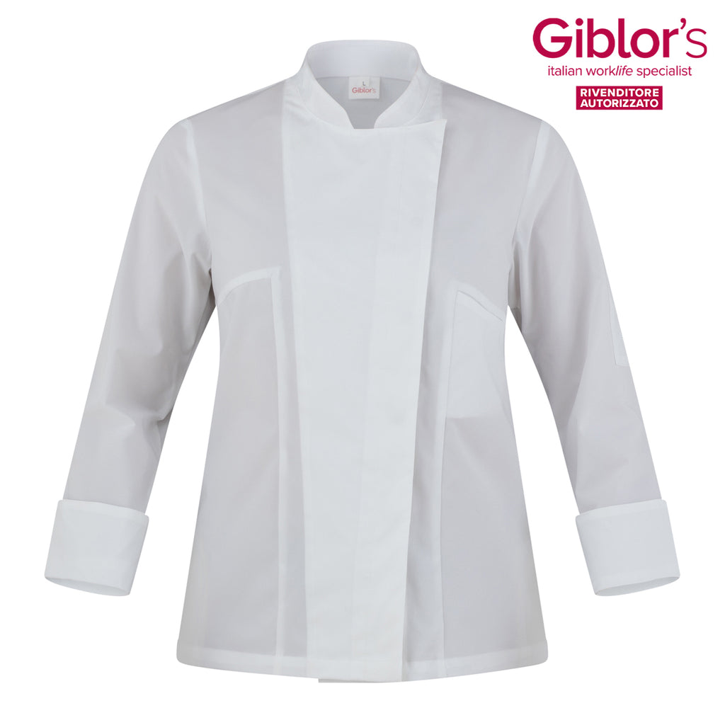 La giacca Gloria è uno dei capi bestseller Giblor's. è realizzata nel nuovo G-TECH PRO, un tessuto dalle incredibili performance: antibatterico, mantiene un'eccellente traspirabilità, è lavabile ad alte temperature, tollera gli spruzzi di candeggina, asciuga velocemente, è no-stiro e non stinge. Gloria presenta il collo alla coreana dalla linea arrotondata, che ben si accorda con l'abbottonatura nascosta, due spacchi nel retro che ne delineano il taglio Slim Fit, un taschino sul petto lato cuore e un portapenne logato sulla manica. è disponibile nelle varianti bianca e nera ed ha sua versione maschile nella giacca Giorgio.