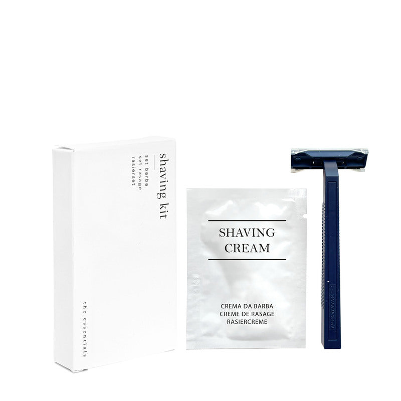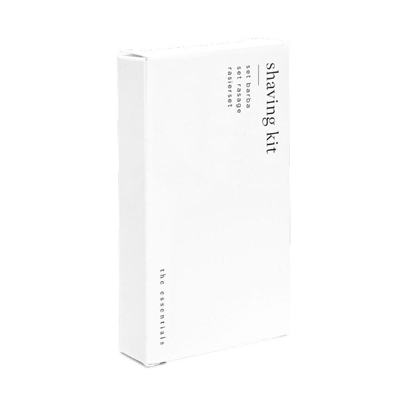 Set barba in astuccio di carta bianca 100% riciclabile. Un complemento dal design minimal che ben si adatta a diverse tipologie di strutture in abbinamento alla classica linea cortesia.